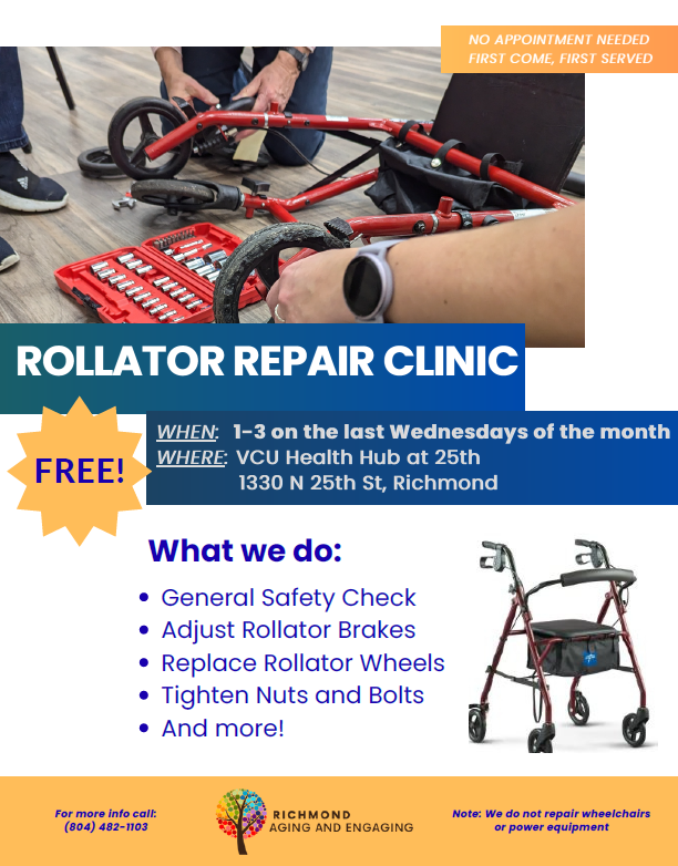 Richmond Aging and Engaging will be repairing rollators at the VCU HealthHub on Wednesday, February 25, from 1-3pm.